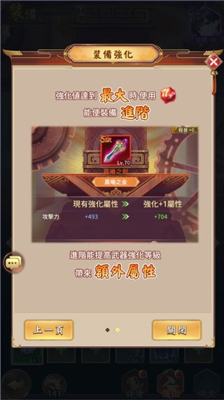 ※使用金币与红宝石强化装备,强化满级后可进阶提升装备属性。