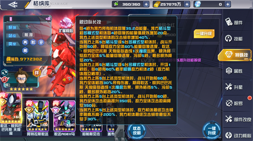 此外,机体的队长技“惊异之红”在我方上阵5台格斗型或多模式型机体时,能大幅压制敌方的能量回复与攻击频率,同时提升我方全体的格挡能力,形成显著的战术优势。其4技能“惊异推进器天式”更是为团队提供了强力的护盾支持与反制手段,尤其在面对高爆发阵容时表现突出。